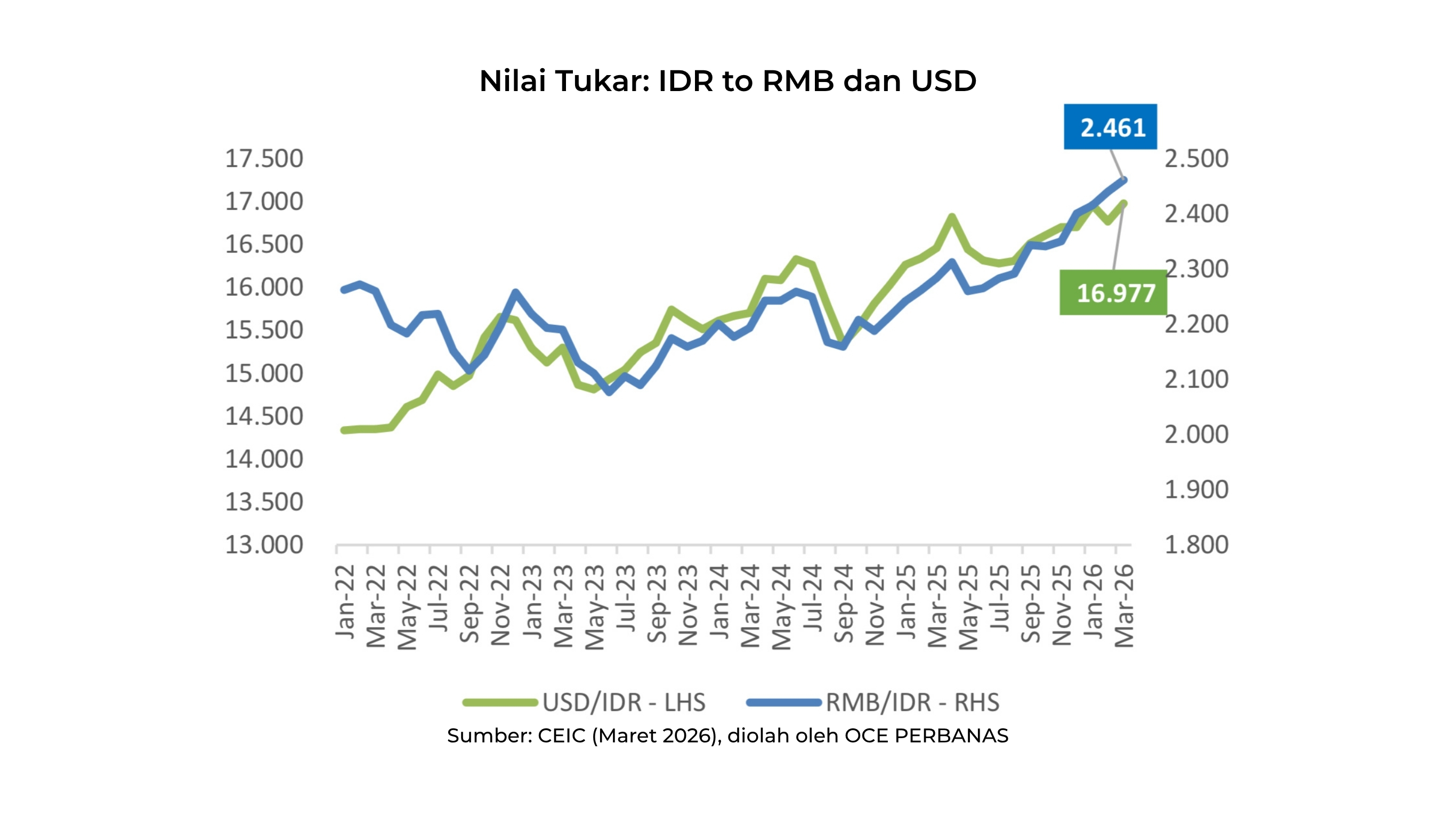 Nilai tukar Rupiah pada Maret 2026 masih dalam tren pelemahan dan mendekati Rp17.000/USD, dengan posisi Rp16.977/USD dan Rp2.461/RMB. Ruang stabilisasi semakin terbatas akibat potensi arus keluar modal di tengah ketidakpastian global dan penguatan dolar AS sebagai safe haven. Karena itu, Bl mempertahankan BI Rate di 4,75% untuk menjaga daya tarik aset domestik dan menahan tekanan terhadap Rupiah, guna memitigasi risiko instabilitas makroekonomi.