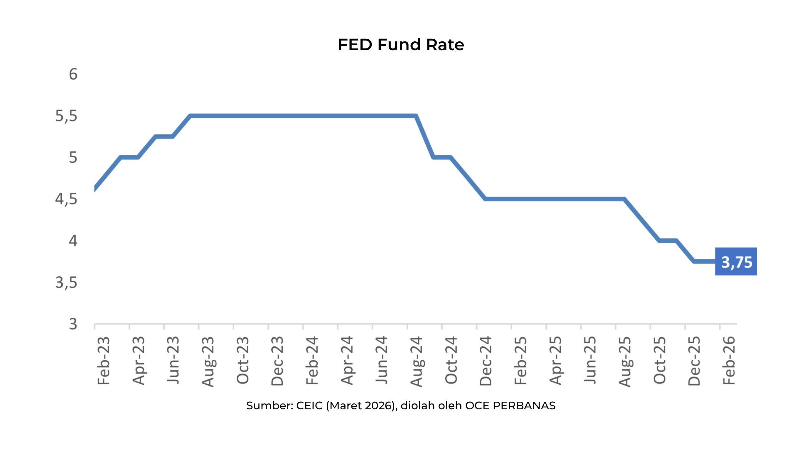 Suku bunga The Fed (FFR) pada Februari 2026 berada di 3,75%. Inflasi AS pada Februari 2026 sebesar di 2,6% (yoy), di atas target 2%, sehingga ruang pelonggaran kebijakan tetap terbatas. Di tengah eskalasi konflik Timur Tengah yang berpotensi mendorong kenaikan harga energi dan inflasi, The Fed diperkirakan akan lebih berhati-hati. Ke depan, arah suku bunga sangat bergantung pada perkembangan konflik tersebut.