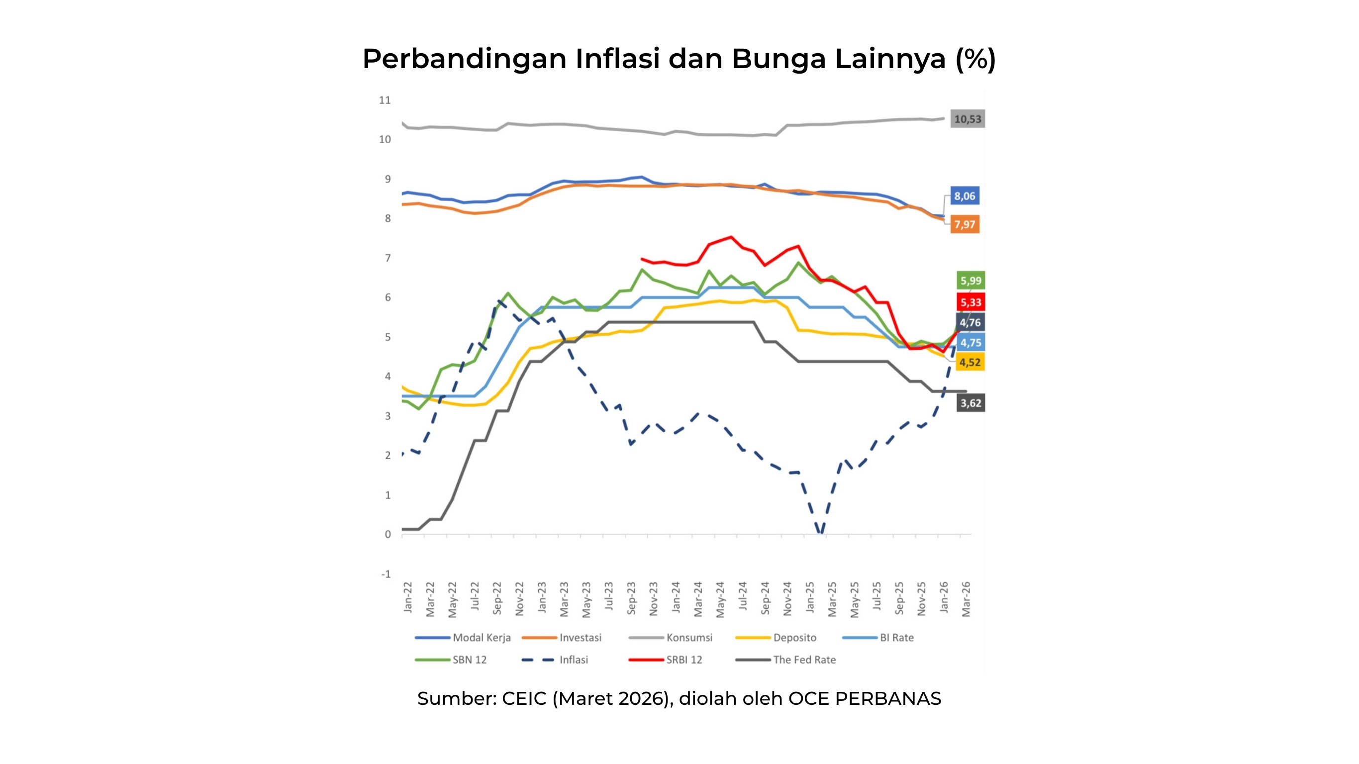 Sementara itu, tingkat imbal hasil SBN naik dari 5,06% (Februari 2026) menjadi 5,99% (Maret 2026) dan Suku Bunga SRBI naik dari 5,04% (Februari 2026) menjadi 5,33% (Maret 2026).